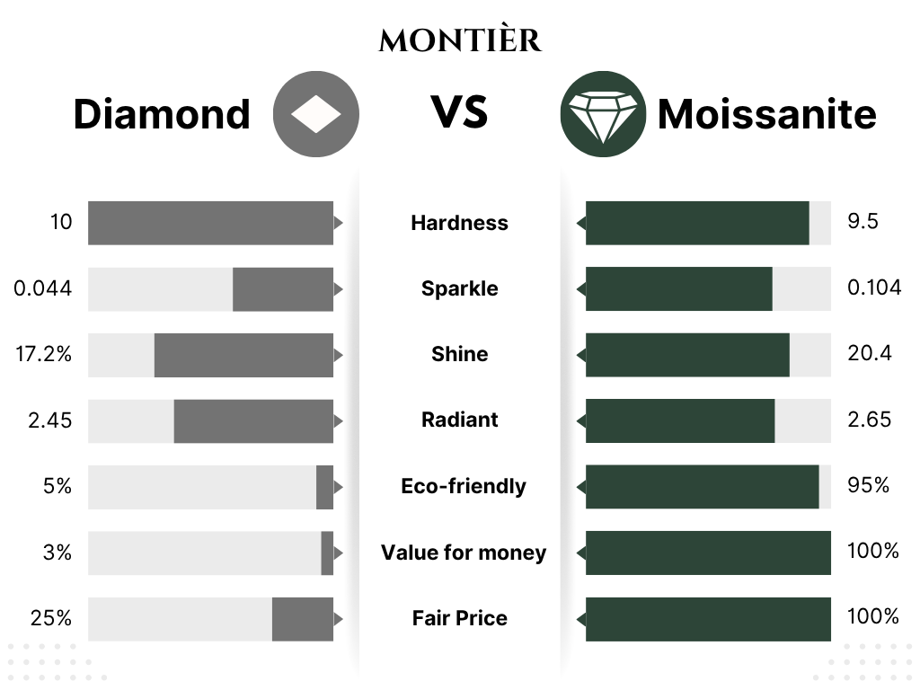 Moissanite delivers a diamond-identical look and quality indistinguishable to the naked eye with elite durability (~9.5 Mohs) and exceptional brilliance, yet at a fraction of the price. Same luxury aesthetic and performance, ethically lab-grown and far better value.
